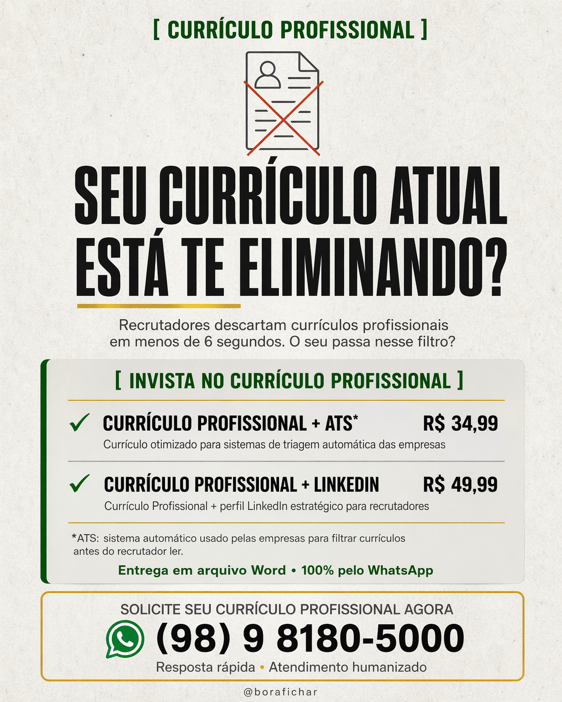 Publicado em Rosejane Maia LeiteTrustindex verifica se a fonte original da avaliação é Google. Excelente experiência. Nunca imaginei conseguir tantos currículos em pouco tempo. Candidatos com todos os perfis possíveis... uma excelente escolha para divulgar vagas com custo mínimo....Publicado em Valéria EstrelaTrustindex verifica se a fonte original da avaliação é Google. Passando p agradecer e incentivar a continuidade do trabalho de vcs ao divulgar vagas de emprego. Através de umas das publicações, fiz o seletivo e consegui a vaga de estágio, estou muito feliz e grata! Parabéns pelo trabalho e que continuem servindo de canal de benção a outras pessoas.Publicado em Escritório principalTrustindex verifica se a fonte original da avaliação é Google. Ótima empresa para divulgação de vagas, possui um bom alcance. Sugestão de melhoria: O envio dos recibos devem ser enviados logo após a publicação.Publicado em João NetoTrustindex verifica se a fonte original da avaliação é Google. Muito obrigado !!! Através da página consegui um novo emprego. Estou passando pelos processos para assinar a CLT. Muito útil. Gratidão.Publicado em Patricia AbreuTrustindex verifica se a fonte original da avaliação é Google. Excelente atendimento! O melhor entre 4 empresas que tentei fechar um anúncio. O atendimento pelo Bot é super objetivo, o tempo de resposta e a celeridade nos processos e fechamento foi incrível. Estão de Parabéns!Publicado em Bruno MoreiraTrustindex verifica se a fonte original da avaliação é Google. O trabalho das plataformas Bora Fichar no Estado do Maranhão é importantíssimo e tem finalidade tanto para as empresas quanto aos candidatos que buscam recolocação ou melhores propostas de emprego. Utilizo esse ótimo alcance para poder divulgar as vagas do Grupo Parvi, e só tenho ótimos elogios como feedback ao trabalho deles.Publicado em Miss Glamour SlzTrustindex verifica se a fonte original da avaliação é Google. Maior instagram de São Luis para anúncio de vagas. Ótima visibilidadePublicado em Dalana SoaresTrustindex verifica se a fonte original da avaliação é Google. Publicado em L&C PromotoraTrustindex verifica se a fonte original da avaliação é Google. Uma pagina muito assertiva, atendimento humanizado. Excelente trabalho de divulgação, recomendo a todos.Publicado em Licia OliveiraTrustindex verifica se a fonte original da avaliação é Google. Rápidos e eficientes nas divulgações e atendimento.